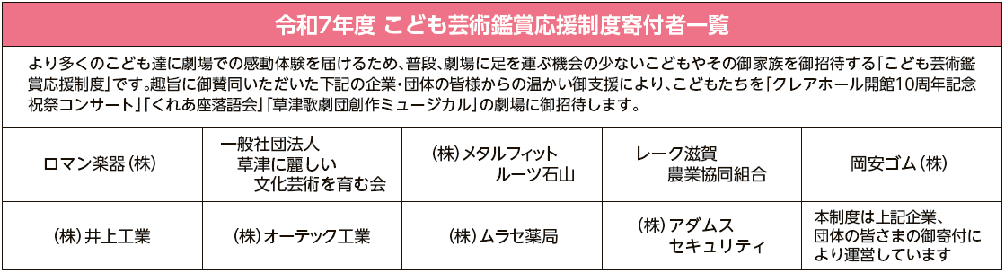 トピックス 2020.07.212025.12.26 2025年12月25日草津アートセンタークレアホール開館10周年記念 祝祭コンサート 満員御礼!2025年12月9日草津アートセンターロビーコンサート イルミネーションとともに ひ・と・あ・し・早・い クリスマス2025年12月9日草津アートセンター草津市芸術祭2025 大盛会の内に幕を閉じました!2025年11月23日草津アートセンター草津市芸術祭2025 がいよいよ開幕しました!2025年10月4日草津アートセンター青春ポップスロビーコンサート第三弾!開催します! もっと見る