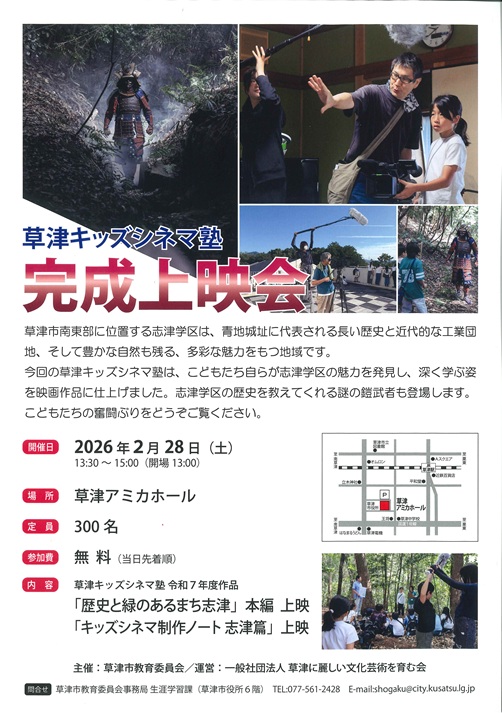 草津キッズシネマ塾 完成上映会 公演概要 日時 2026年2月28日(土) 13:30~15:00(13:00 開場) 会場 草津アミカホール 詳細 草津キッズシネマ塾 令和7年度作品 〇「歴史と緑のあるまち志津」本編 上映 〇「キッズシネマ制作ノート 志津篇」上映 料金 参加費 無料(当日先着順) 定員 300名 その他 お問い合わせ 草津市教育委員会事務局 生涯学習課 TEL:077-561-2428 チラシ チラシ(PDF) Date 2026年2月 28日(土) Labels 貸館 場所 草津アミカホール 〒525-0034 滋賀県草津市草津3丁目13−30 Website https://goo.gl/maps/TezJkEvLfwuWGAPaA カテゴリ 草津アミカホール 主催者 草津市教育委員会事務局 生涯学習課 Phone 077-561-2428 Share this event